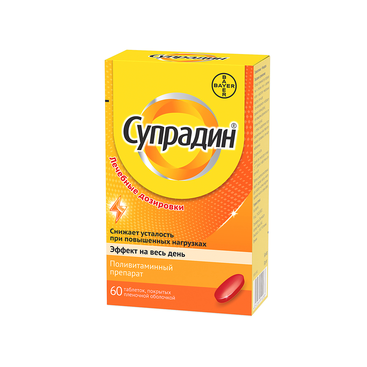 Длительность лечебного или профилактического варьируется от одного до трех месяцев. При серьезном расстройстве работы организма на фоне недостаточности витаминов и минералов целесообразно повторить его после 2-недельного перерыва. Если спустя 2-3 недели лечения самочувствие не улучшается, необходимо сообщить об этом врачу. Он назначит дополнительные средства или заменит Супрадин аналогами с более высоким количественным содержанием активных ингредиентов.