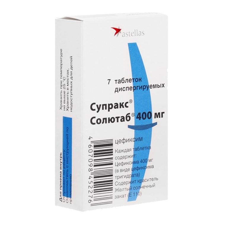 Диспергируемые (рассасываемые) таблетки могут содержать 400 или 200 мг цефиксима. Их коммерческое название Супракс Солютаб. В коробке может быть 6 или 7 шт.