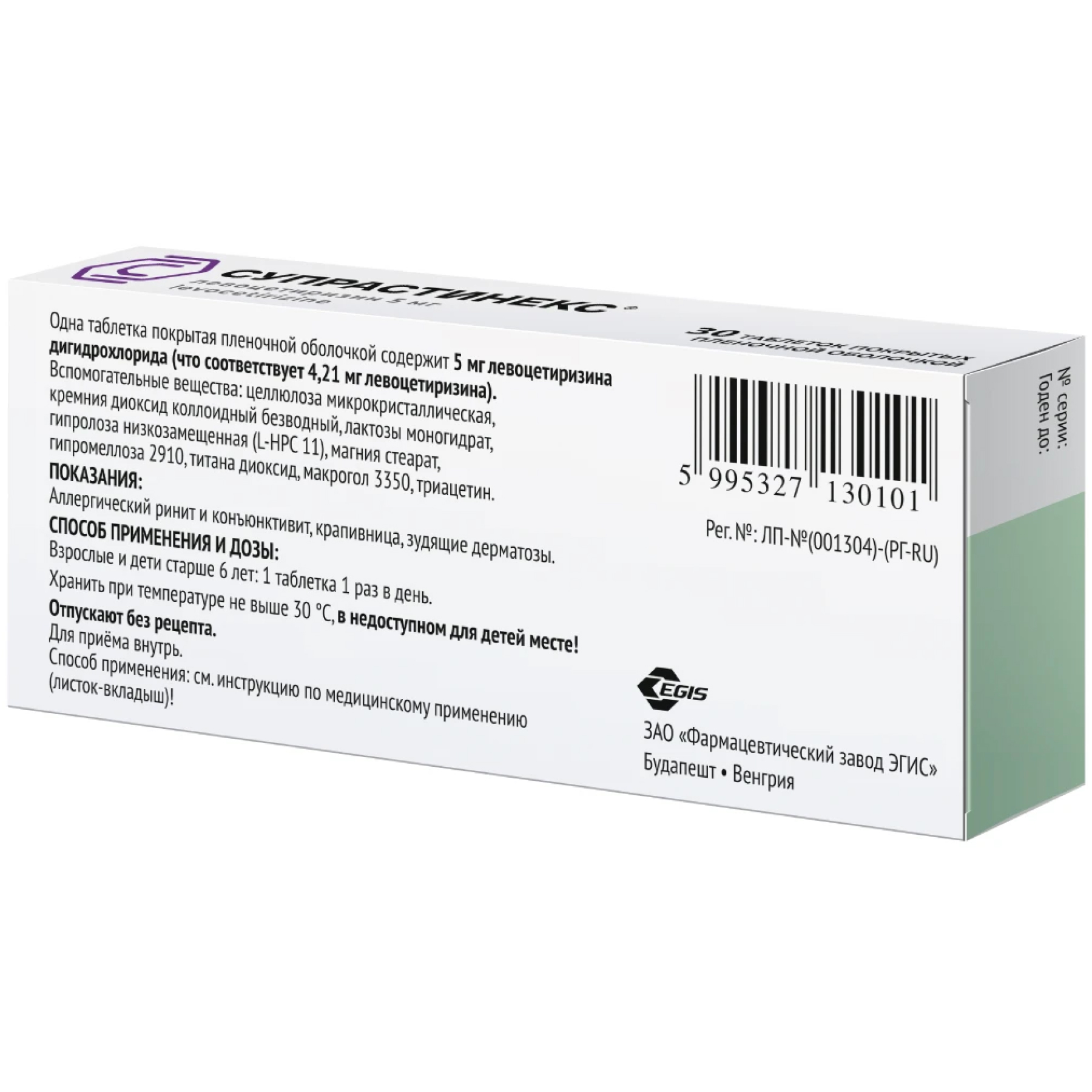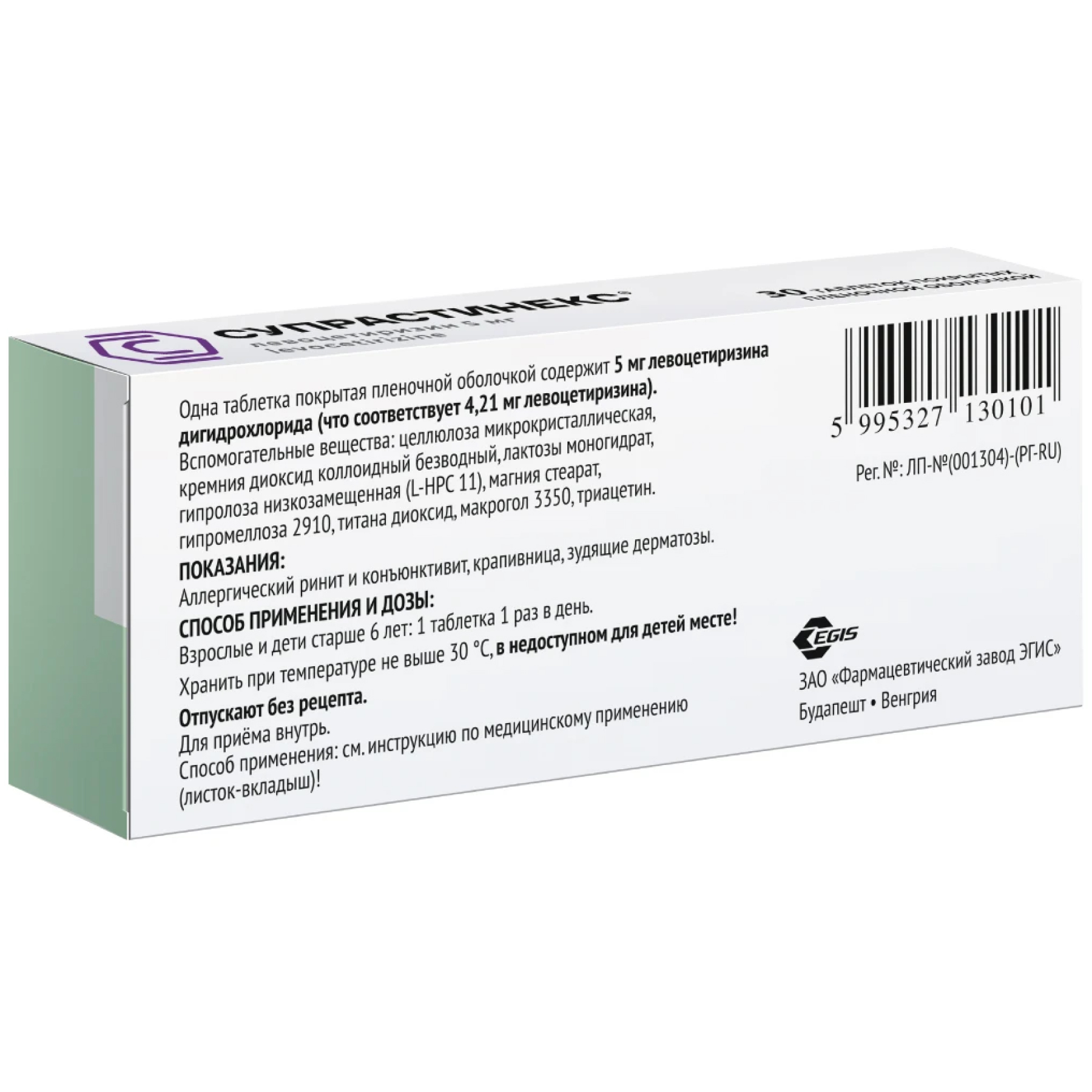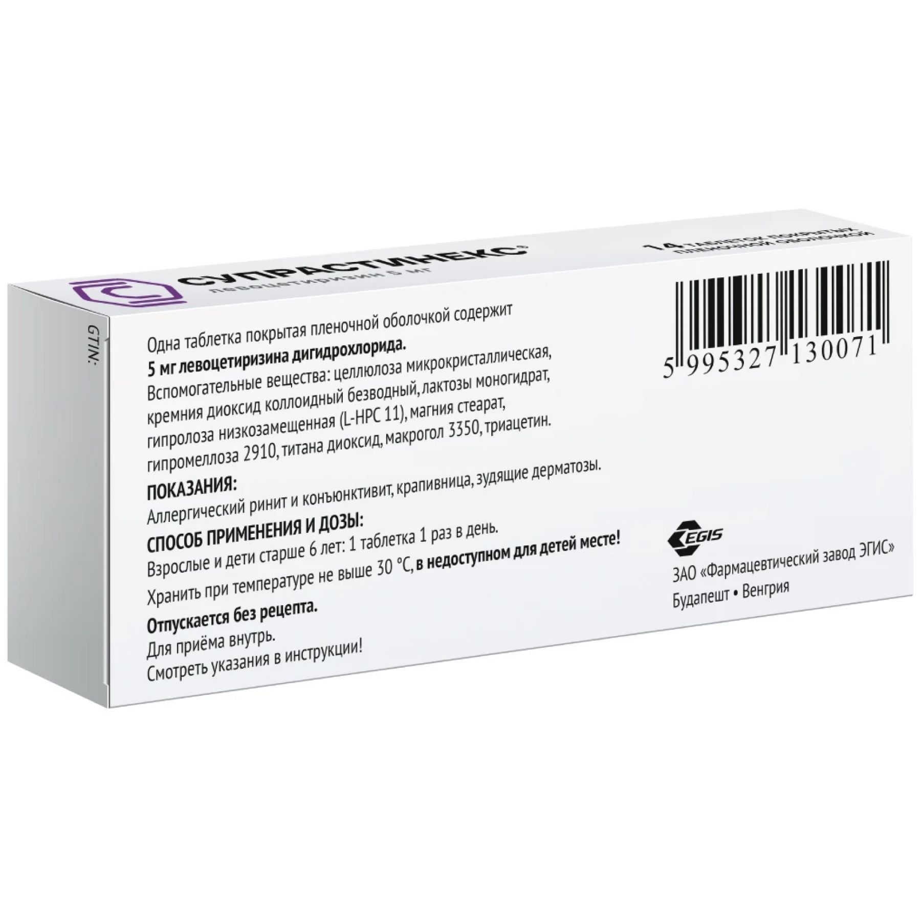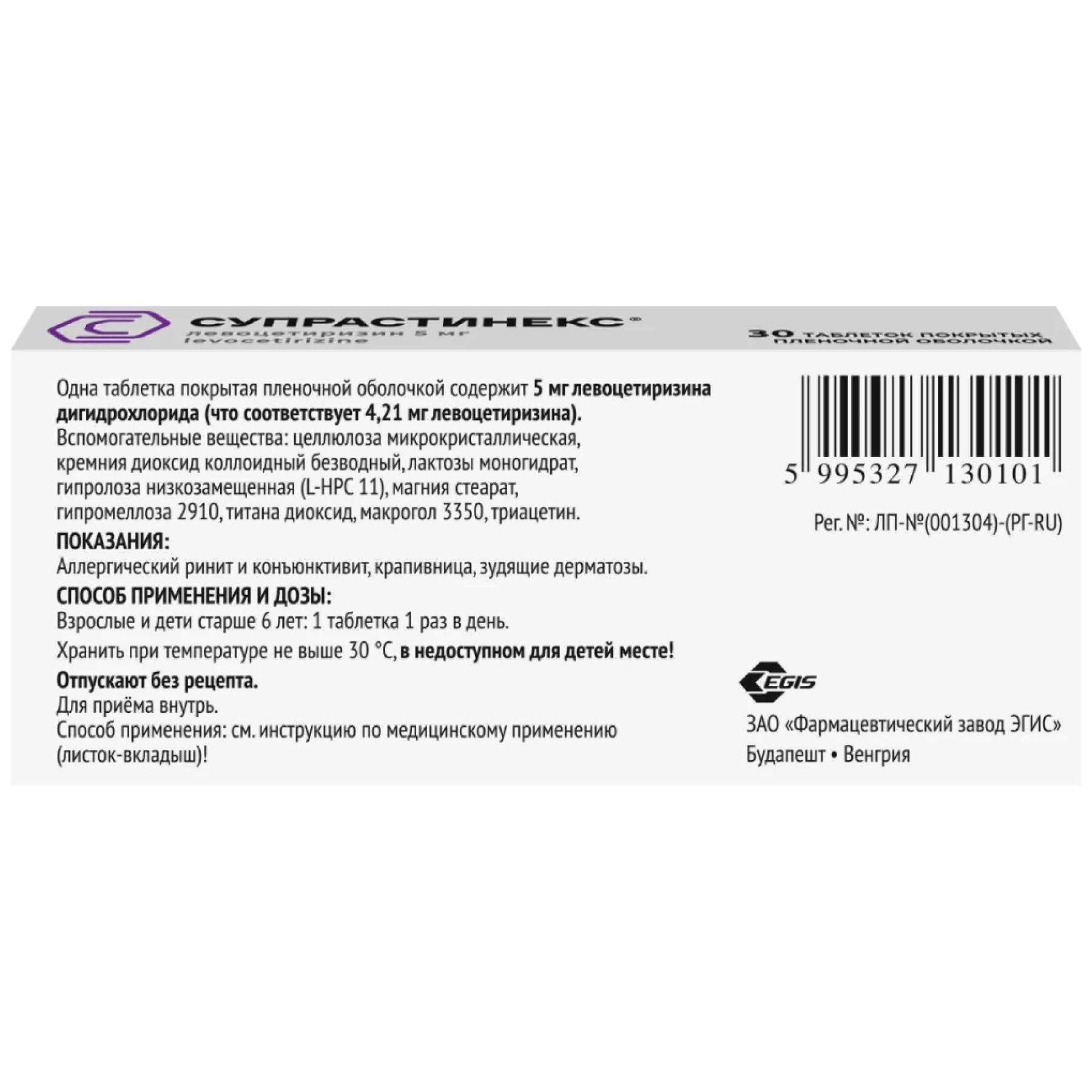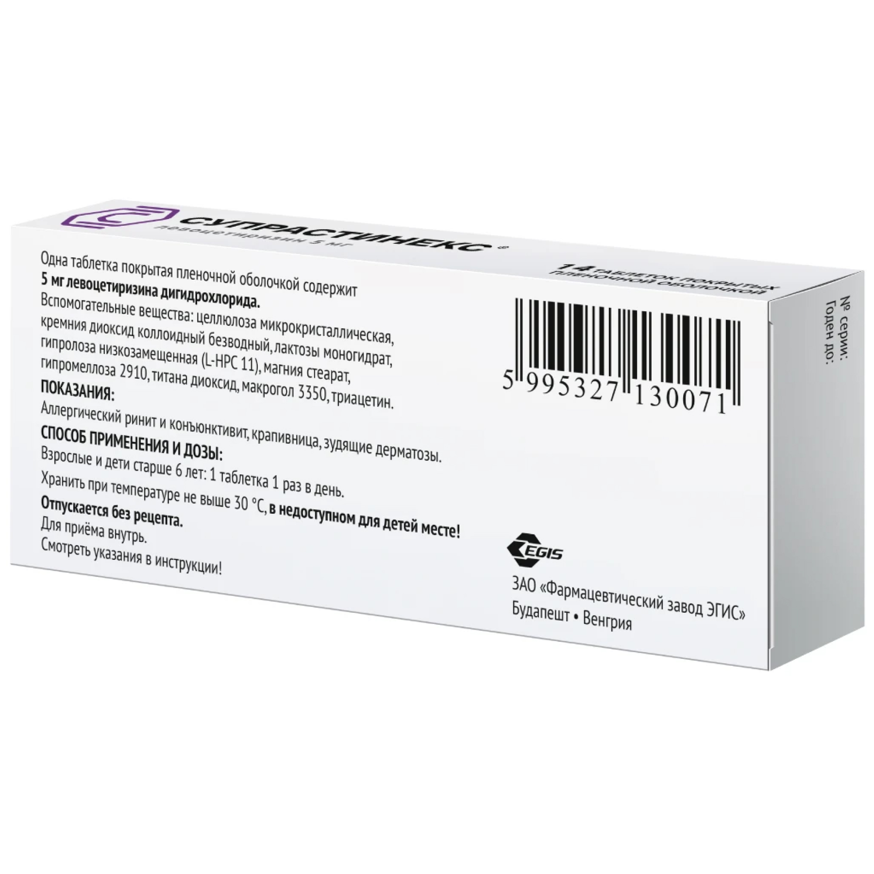 ЛевоцетиризинСупрастинекс выпускается венгерской фармацевтической компанией ЭГИС в виде двояковыпуклых таблеток со сладкой кишечнорастворимой оболочкой. Находятся они в ячейках блистеров из металлизированной фольги, в свою очередь вложенных в картонные коробки вместе с инструкциями по применению.