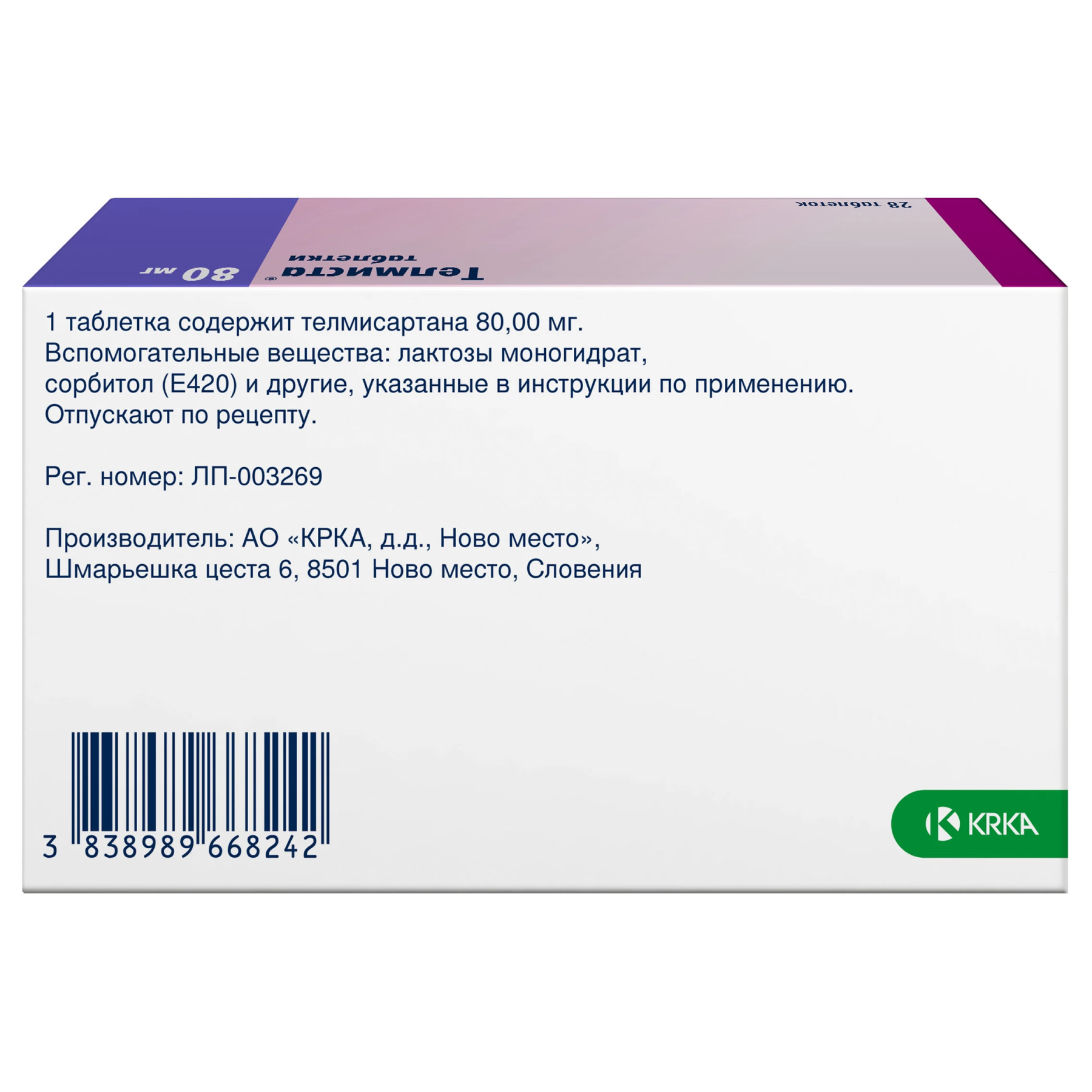 Одна таблетка Телмиста содержит 40 или 80 мг активного вещества – телмисартана. В перечень вспомогательных компонентов входят: меглюмин, натрия гидроксид, повидон К30, лактозы моногидрат, сорбитол (Е420), магния стеарат.