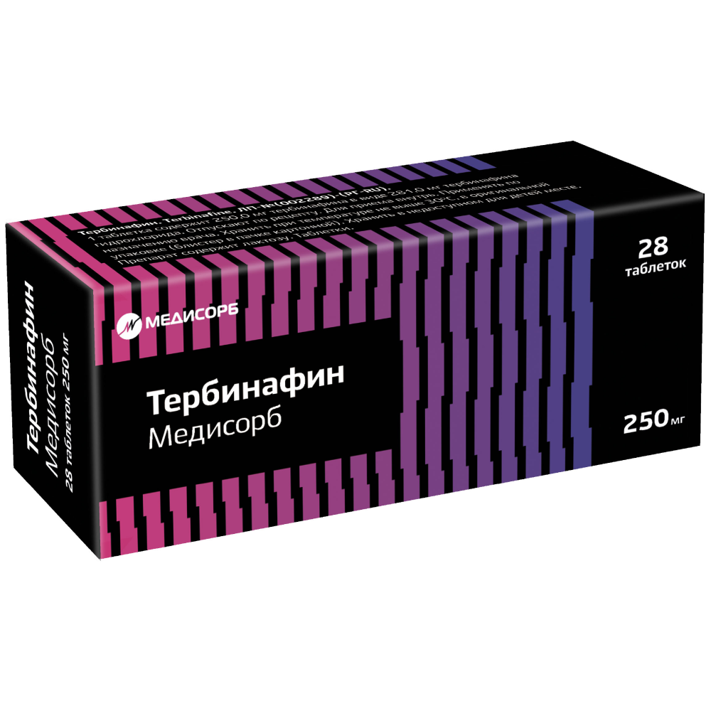 В одной таблетке содержится: 281 мг тербинафина гидрохлорида (250 мг в пересчете на тербинафин).