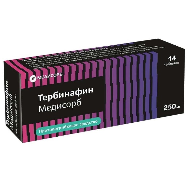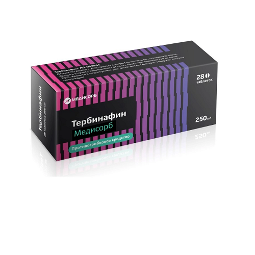 В одной таблетке содержится: 281 мг тербинафина гидрохлорида (250 мг в пересчете на тербинафин).