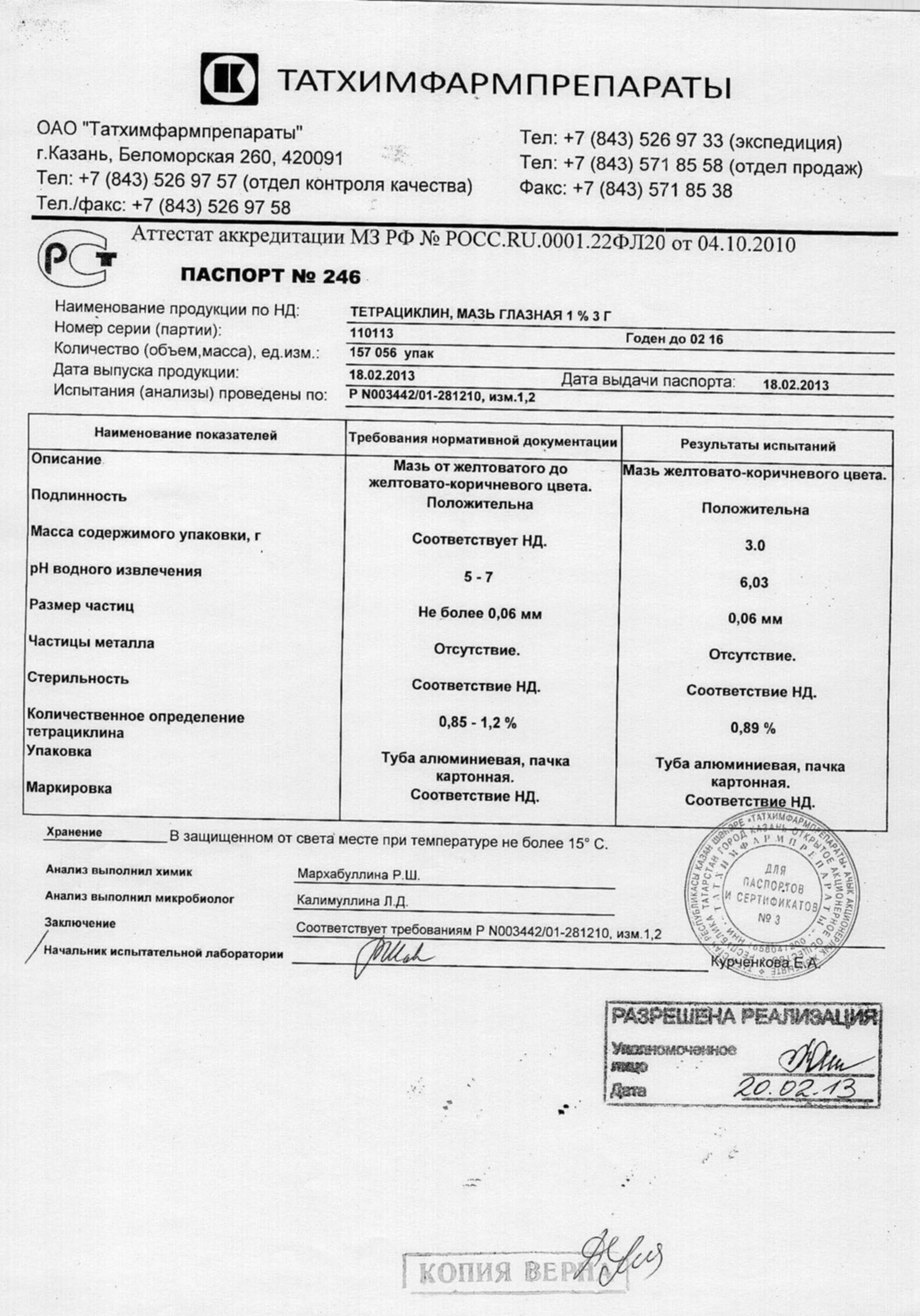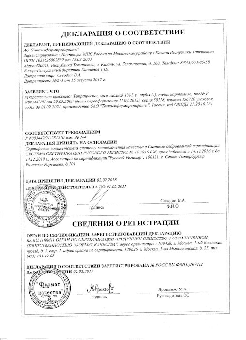 В описании к инструкции по применению к тетрациклиновой мази, в составе средства указаны также вспомогательные вещества - ланолин, парафин, церезин.