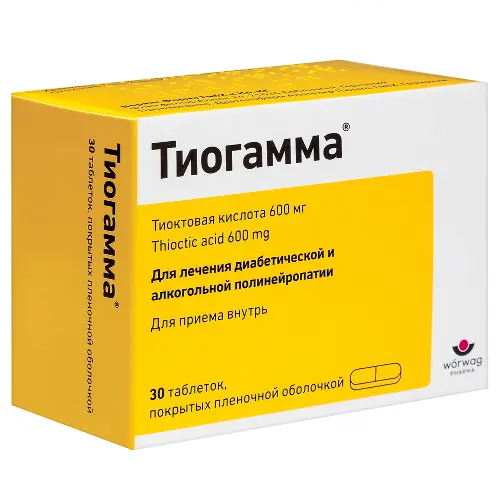 Тиоктовая кислотаПроизводитель предлагает два вида препаратов, содержащих тиоктовую кислоту (цену Тиогамма можно уточнить в аптеке). Лекарство выпускается в виде покрытых пленочной оболочкой таблеток. В них содержится 600 мг главного компонента. В блистере находится 10 шт., в упаковке может быть 3, 6 или 10 блистеров (соответственно 30, 60 или 100 таблеток).