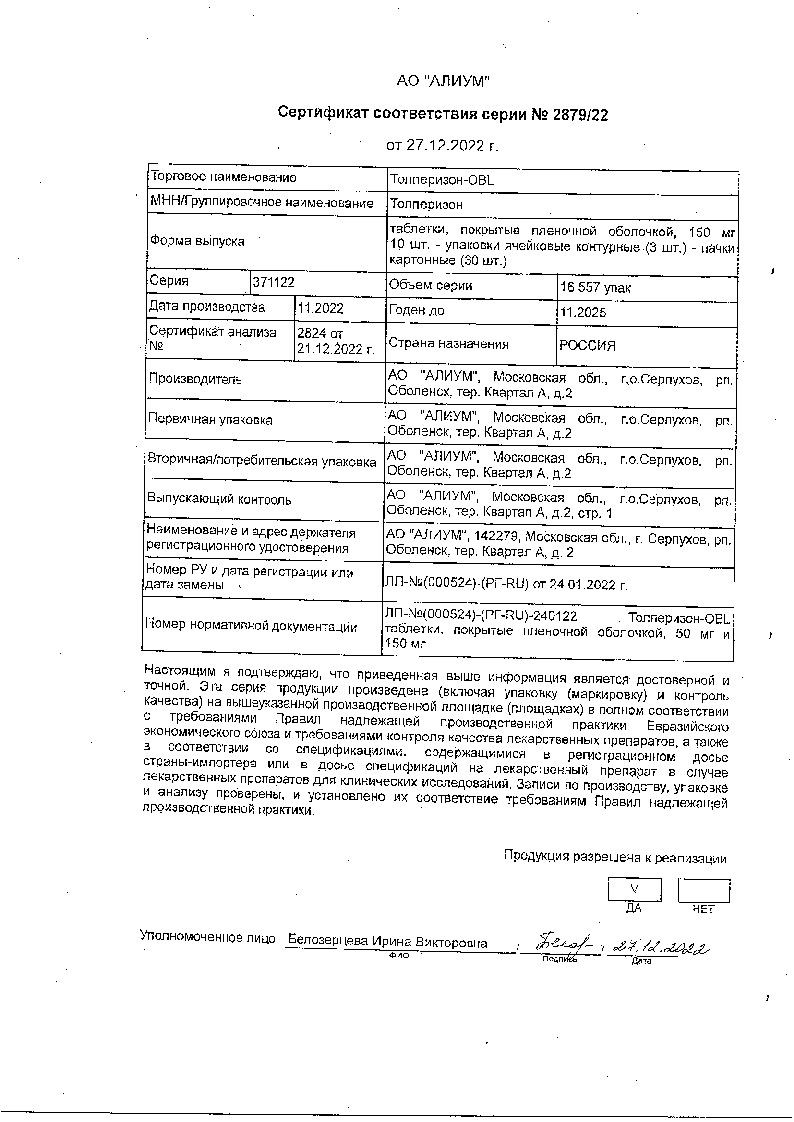 Толперизон в аптеках можно купить в виде таблеток, которые покрыты белой пленочной оболочкой, круглой формы, выпуклостью с обеих сторон и характерным лекарственным запахом. Упаковываются в картонные коробки по 7, 10, 14, 20, 21, 28, 30, 35, 40, 42, 50, 56, 60, 70, 80, 90, 100, 120, 140, 150, 200 или 300 шт. Внутри также присутствует инструкция по применению Толперизона на бумажном носителе.