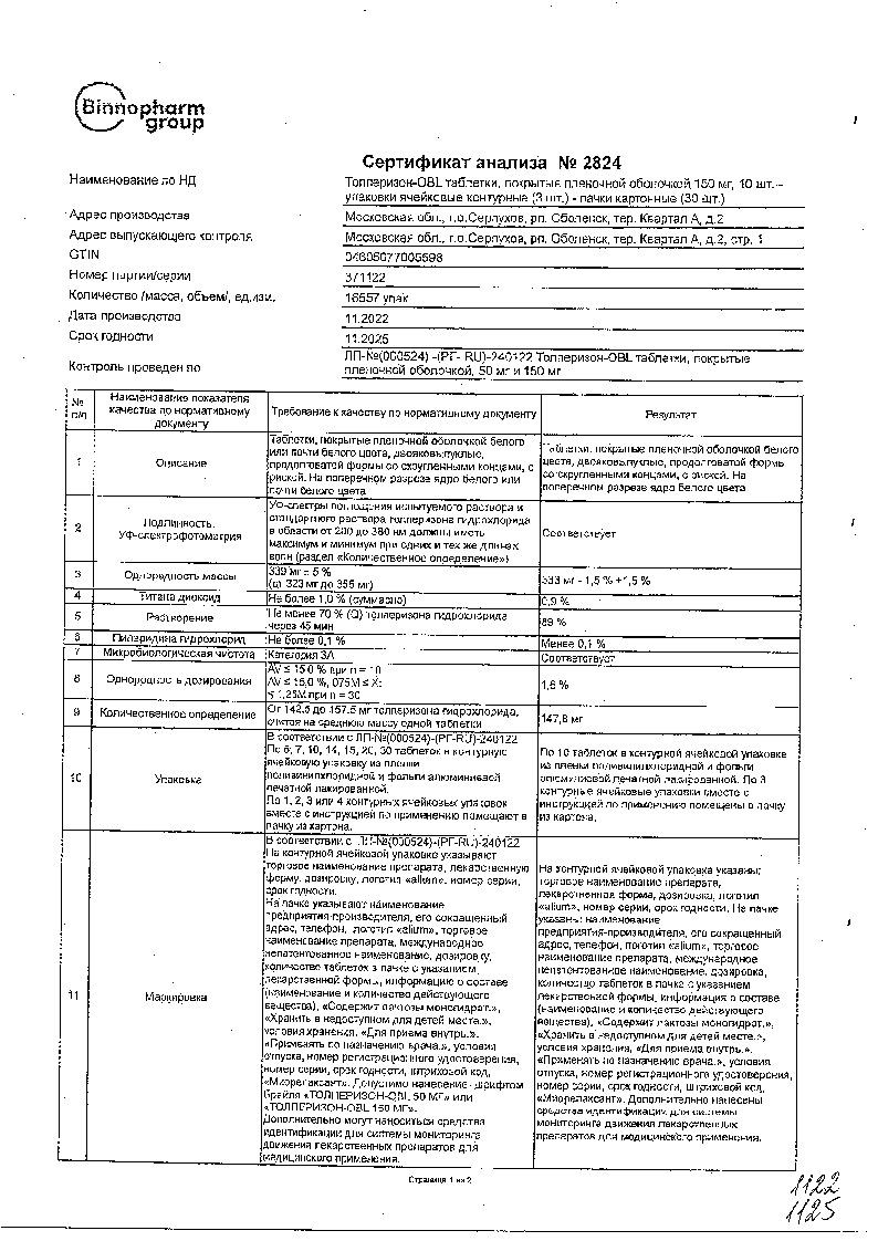 - активное вещество толперизона гидрохлорид – 50 мг или 150 мг.