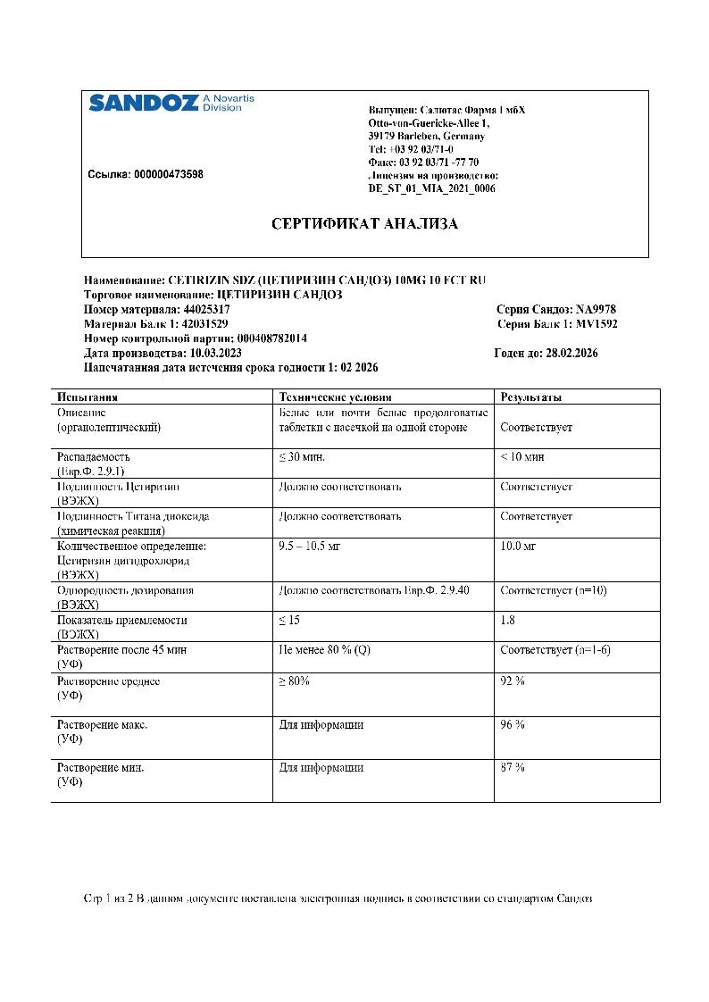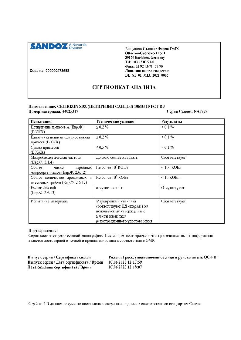 Терапевтические эффекты препарата проявляются примерно спустя четверть часа и сохраняются на протяжении суток. Всасывание действующего вещества происходит на протяжении всего пищеварительного тракта. Создается максимальная терапевтическая концентрация цетиризина в системном кровотоке примерно спустя час после приема таблетки.