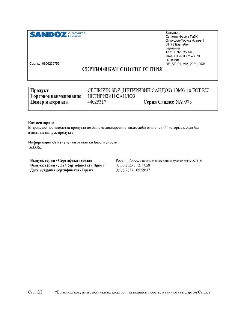 Действующее вещество Цетиризина в кровеносное русло проникает, может оказывать определенное влияние на центральную нервную систему. Поэтому необходимо проконсультироваться с лечащим врачом о возможности выполнения работ, требующих повышенной концентрации внимания, и вождения автотранспорта.