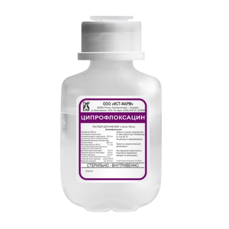 1 мл раствора для инфузий содержит 2 мг активного вещества – ципрофлоксацина. В качестве вспомогательных компонентов используются: раствор натрия хлорида 0,9%, молочная кислота, динатриевая соль ЭДТА, вода для инъекций.