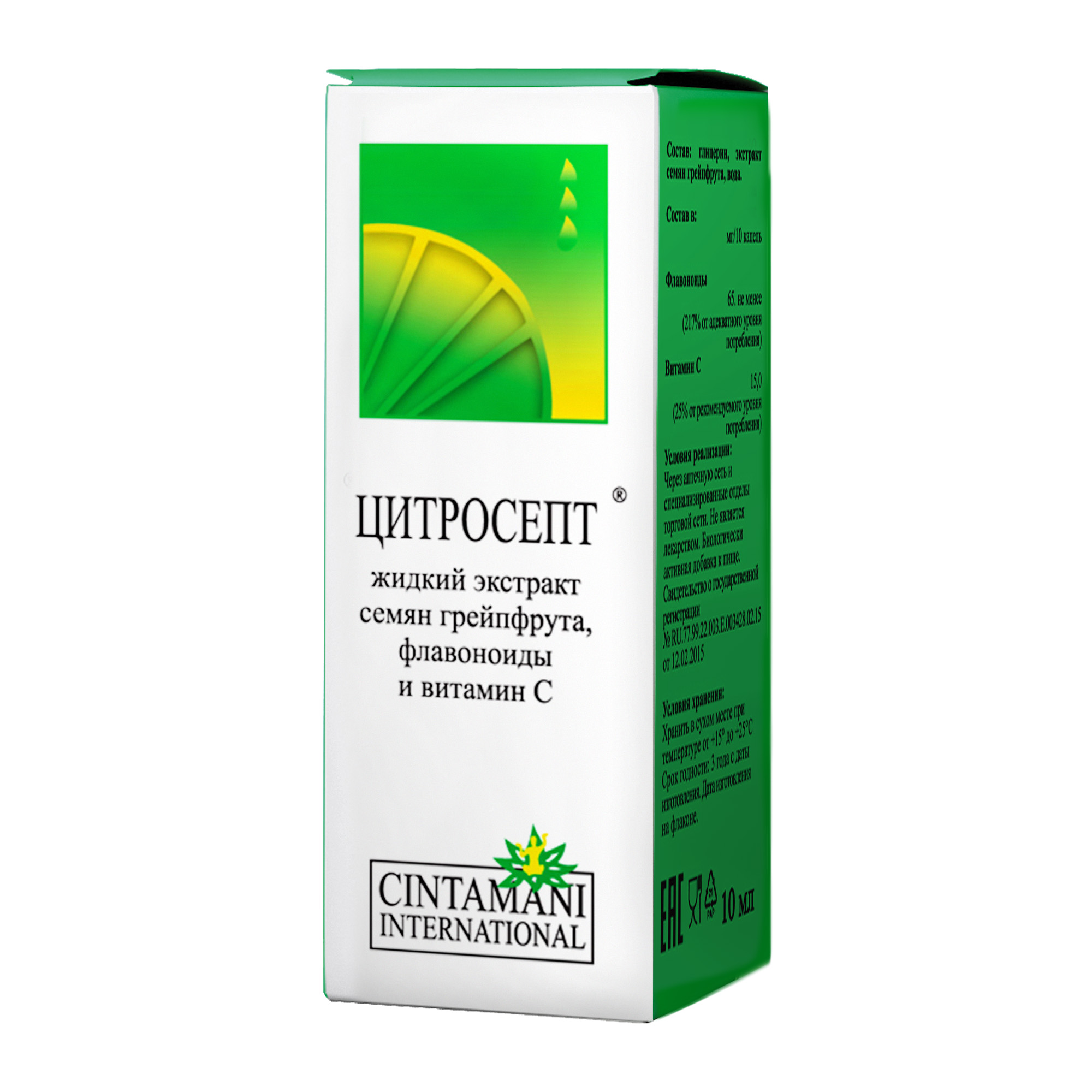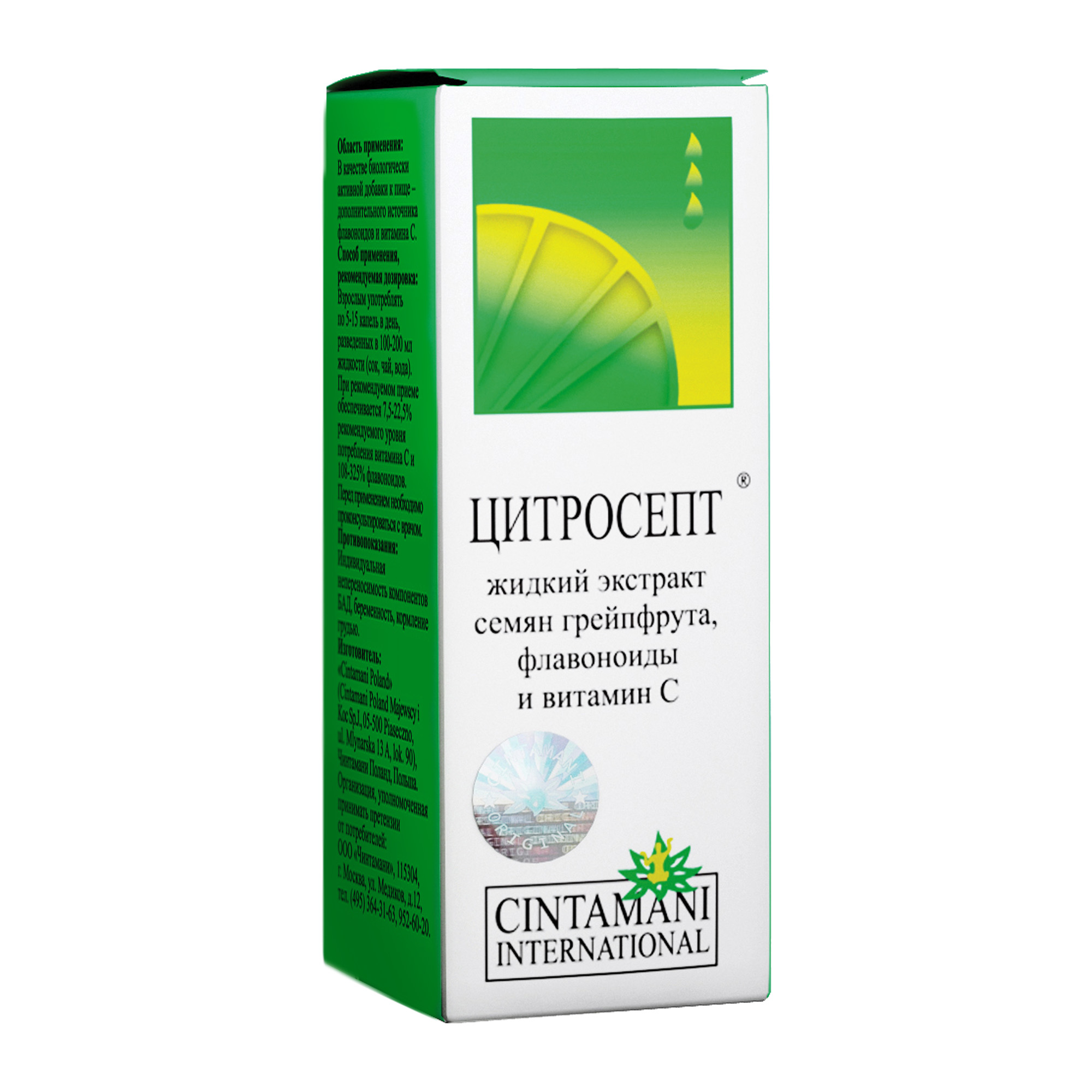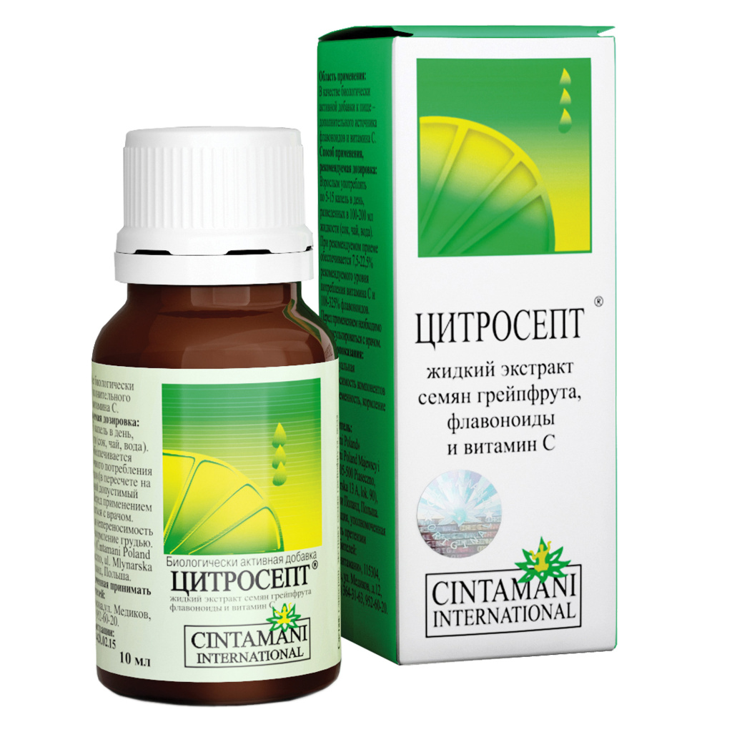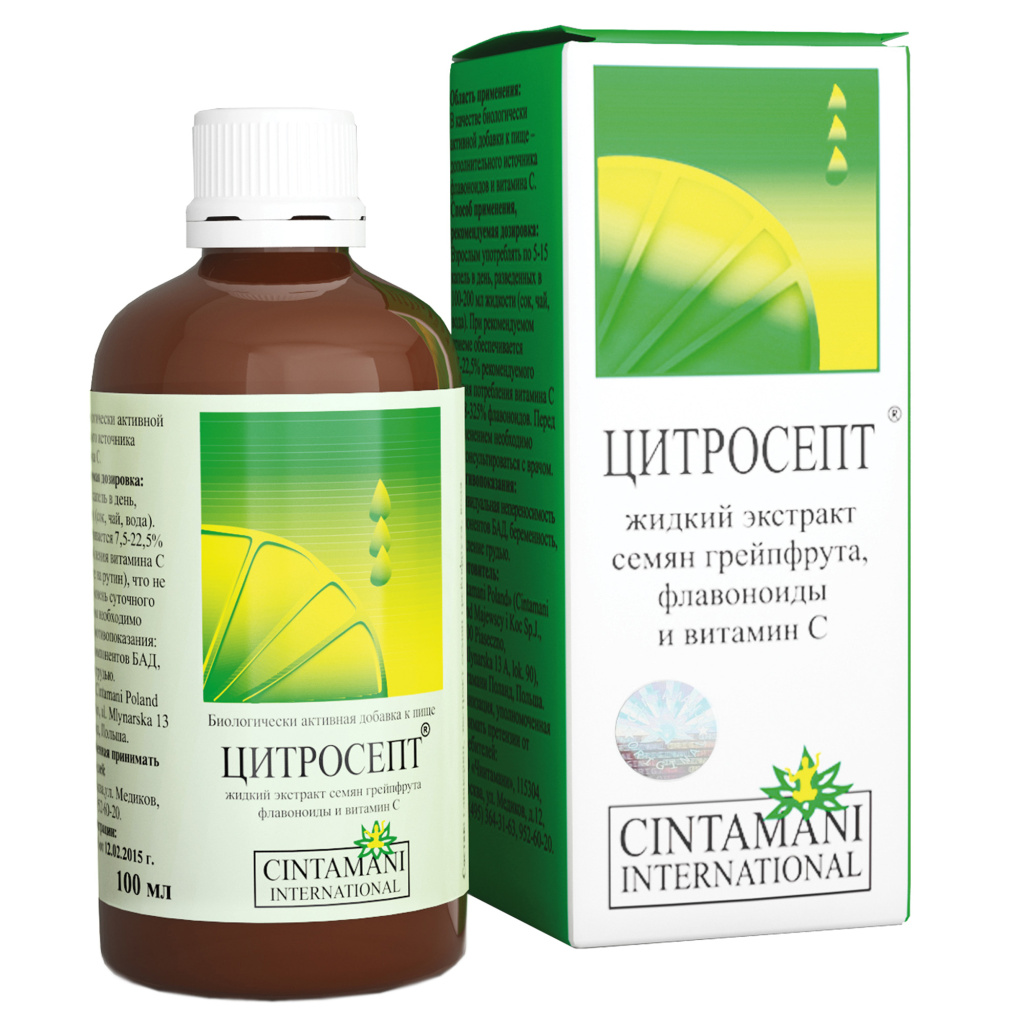 Цитросепт выпускается польской фармацевтической компанией Chintamani International в виде вязкого раствора с горьковатым вкусом и выраженным цитрусовым ароматом. Он помещен во флаконы из темного стекла, которые вложены в компактные картонные коробки вместе с подробными инструкциями по применению. Активный состав препарата представлен биофлавоноидами и аскорбиновой кислотой. А для формирования вспомогательного производитель воспользовался такими ингредиентами: