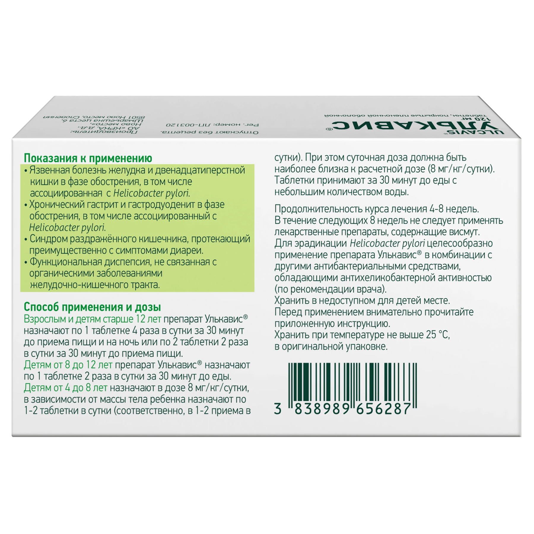 - взрослым и детям с 12 лет – по 1 штуке Улькависа 120 мг четыре раза в день или по 2 табл. (240 мг) два раза в день;