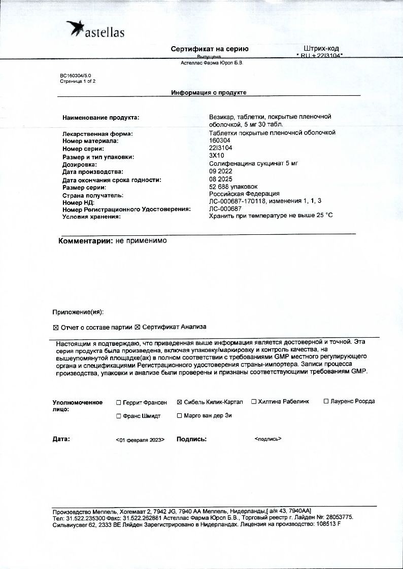 Везикар выпускается в форме круглых, двояковыпуклых таблеток, покрытых светло-розовой пленочной оболочкой. С одной из сторон присутствует маркировка «151», с другой – логотип компании-производителя.
