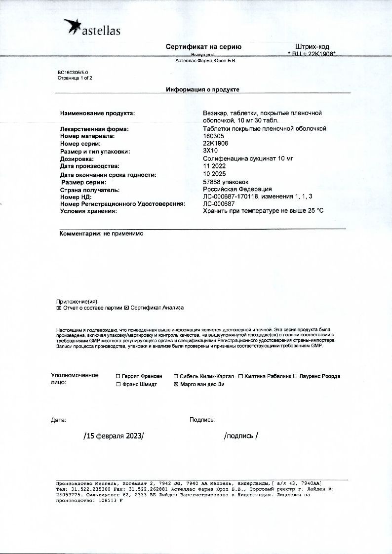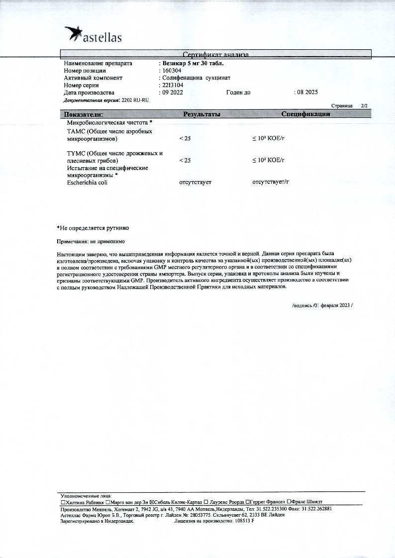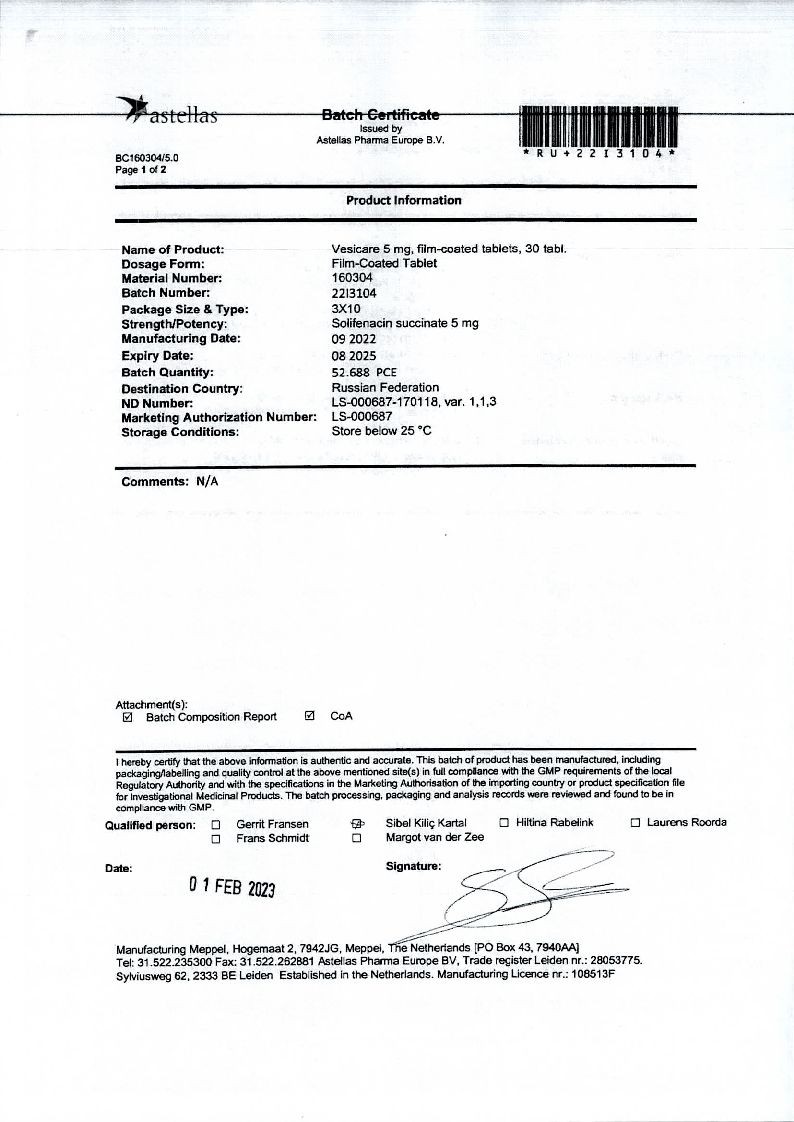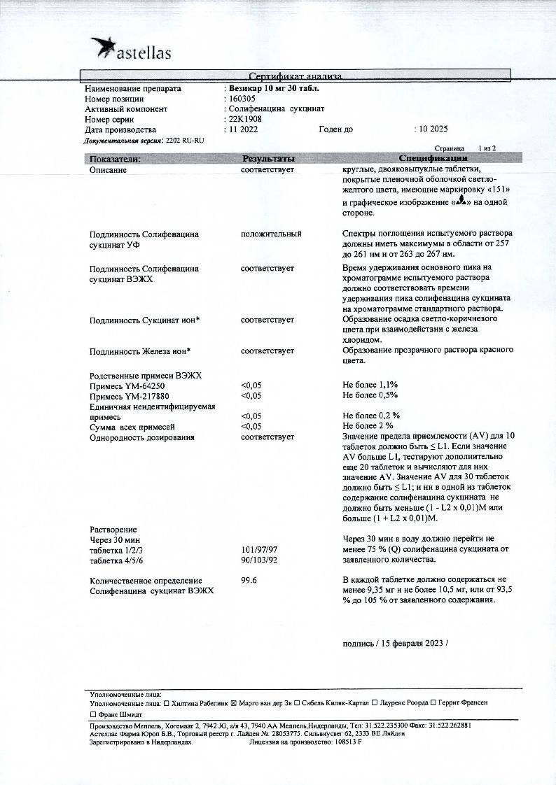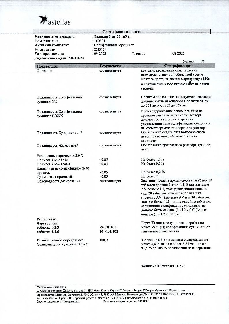 Перед назначением Везикара необходимо провести тщательное обследование пациента на предмет выяснения причин нарушения процесса мочеиспускания. В случае выявления инфекции мочеполовой системы следует начать противомикробное лечение.