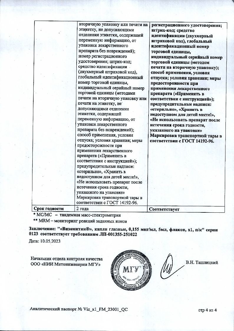Кратность закапывания раствора — трижды в день. Между его введениями должны быть приблизительно одинаковые интервалы времени для поддержания терапевтической концентрации активного вещества в структурах глазного аппарата. Врач оценивает его эффективность через полгода. Он может порекомендовать возобновить курс после небольшого перерыва. При отсутствии должного эффекта врач внесет коррективы в режим дозирования, включит в терапевтическую схему вспомогательные средства или заменит Визомитин аналогом с другим основным компонентом.