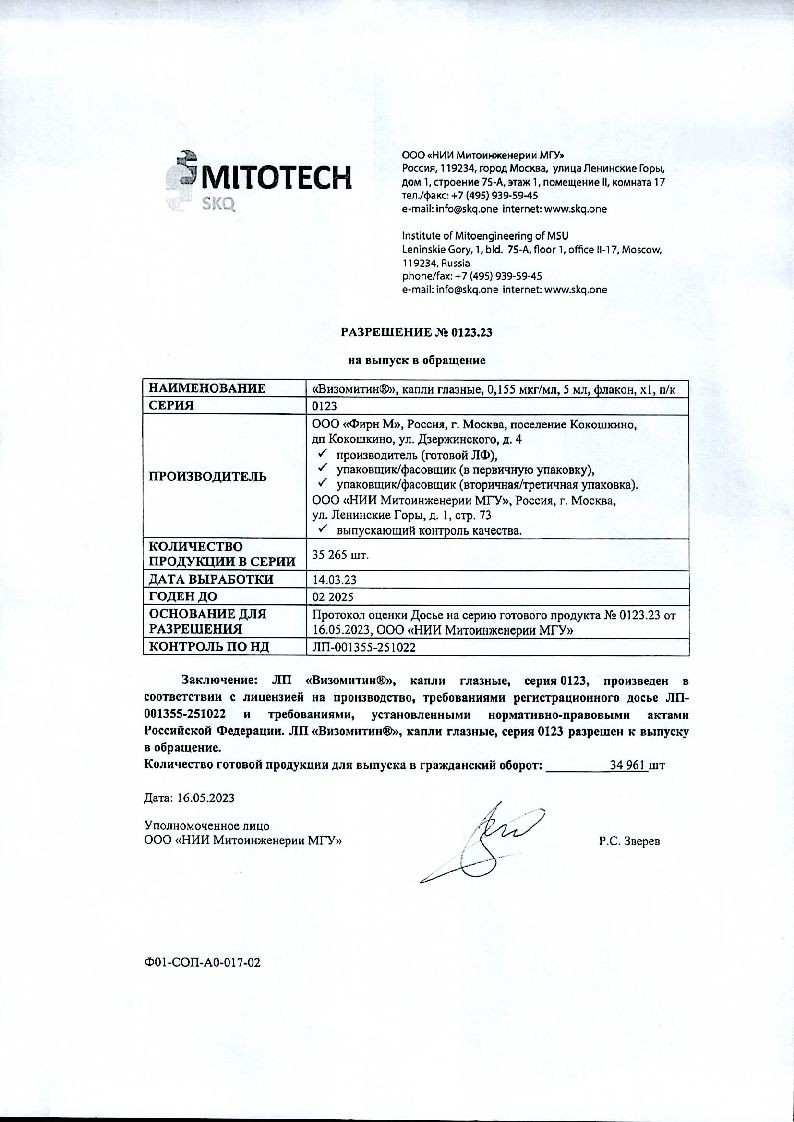 Пластохинонилдецилтрифенилфосфония бромидЛекарственное средство выпускается российской фармацевтической компанией Митотех в форме прозрачной жидкости без посторонних включений. Легкий желтоватый оттенок не указывает на его порчу. Препарат расфасован в пластиковый флакон, в верхней части которого находится дозирующее устройство в виде встроенной капельницы. Вторичной упаковкой офтальмологическому раствору служит картонная коробка с подробной инструкцией по применению.
