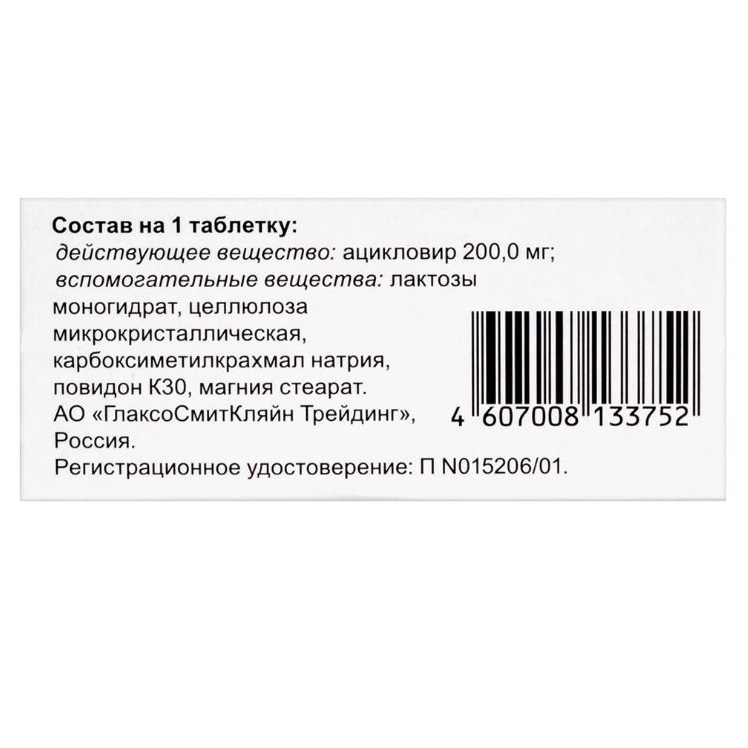 В составе одной таблетки входит действующее вещество Ацикловир 200,0 мг, а также вспомогательные компоненты: